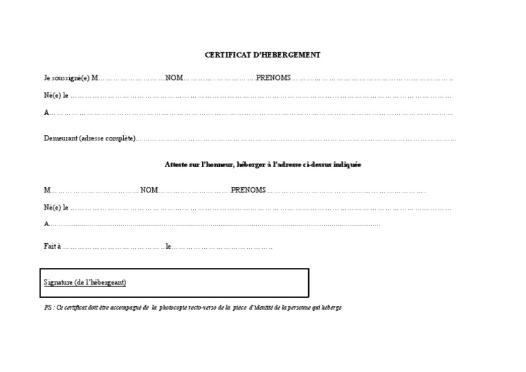 Il s'agit d'un simple document établi sur papier libre, dans lequel l'hébergeant déclare héberger l'héberger. Disponibles en format pdf ou word, il s'agit de modèles d'attestation d'hébergement à imprimer et à compléter. An attestation d'hébergement is a certificate to prove that you are living permanently at an address in france. Nous vous proposons sur notre. Au cas où vous devez produire une attestation d'hébergement pour accomplir une démarche administrative, mais que vous ne disposez pas d'adresse à votre nom, vous pouvez toujours solliciter la personne qui vous reçoit gratuitement de rédiger pour vous une attestation d'hébergement. Sep 29, 2020 · attestation d'hébergement à remplir. Attestation d'hébergement je soussigné( e) : En effet, il peut faire courir les délais qui, non respectés, entraînent des conséquences pour son avenir Sep 29, 2019 · attestation d'hébergement : L'attestation d'hébergement ne répond à aucun formalisme particulier : Tout courrier administratif adressé à la personne hébergée, dans son intérêt, doit lui parvenir rapidement. Attestation d'hebergement (à remplir très lisiblement) attention : Jun 27, 2021 · l'attestation d'hébergement, autrement appelée déclaration ou certificat d'hébergement, est un document justificatif qui peut être demandé à un particulier lors de diverses démarches administratives et commerciales (ouverture d'un compte bancaire, souscription d'un prêt, renouvellement de papiers d'identité auprès de la préfecture ou de la mairie, enregistrement d'un.